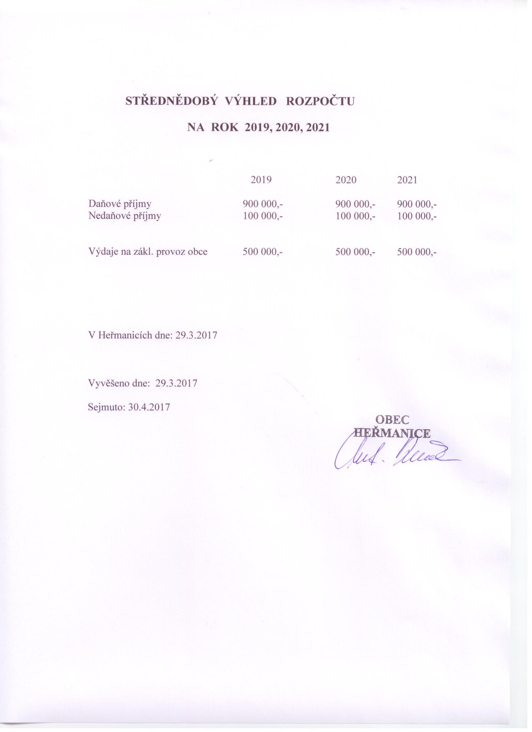 Střednědobý výhled rozpočtu obce Heřmanice na rok 2021, 2022, 2023